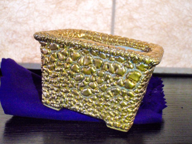 Four different views of a larger gold apricot skin glazed rectangle. The texture is exceptional, and even the underside is glazed. Truly a masterpiece.
