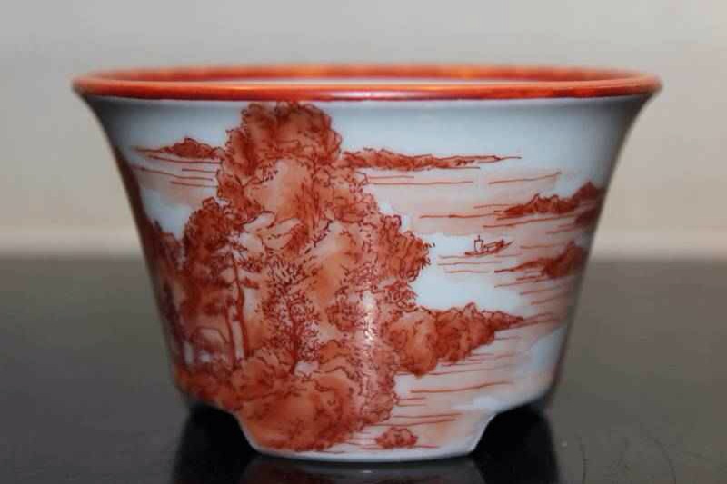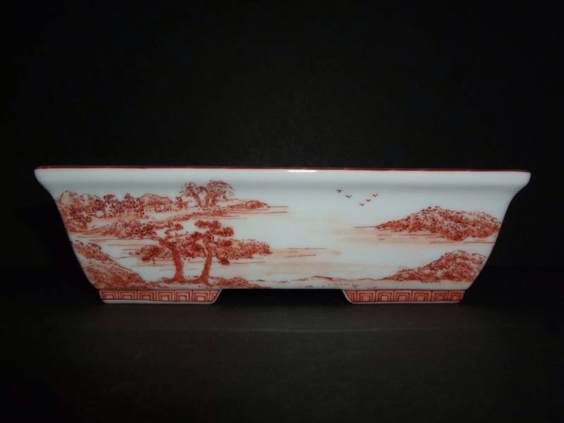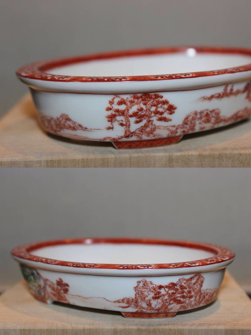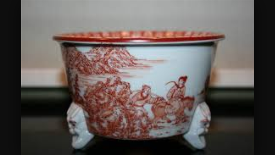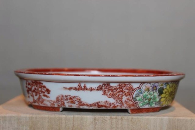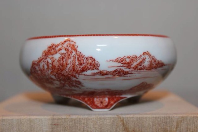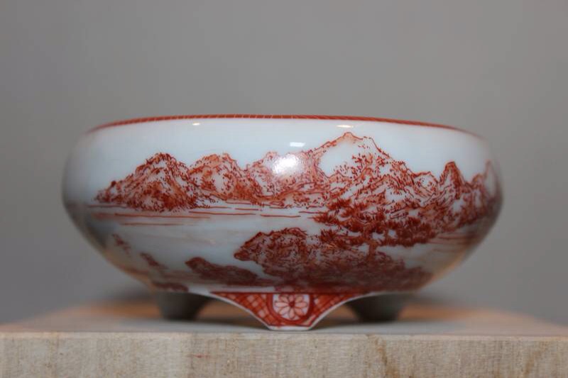 His works are both unique, and classical, and use primarily the Akae and go-Sai that Kutani Yaki is famous for.