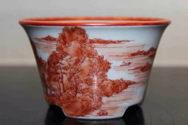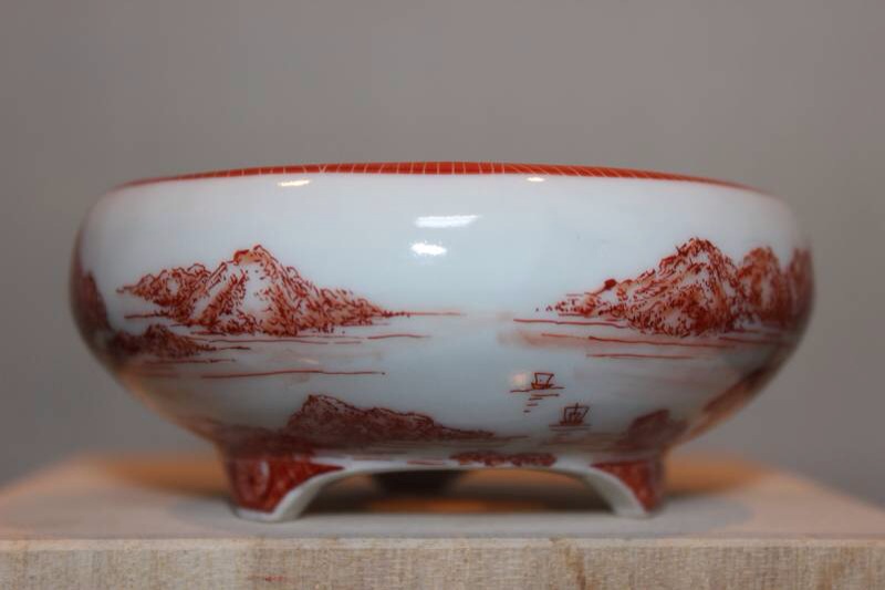 A heavily detailed 5 color landscape.  The small details in this piece are marvelous, and the rim and feet details really make the pot.