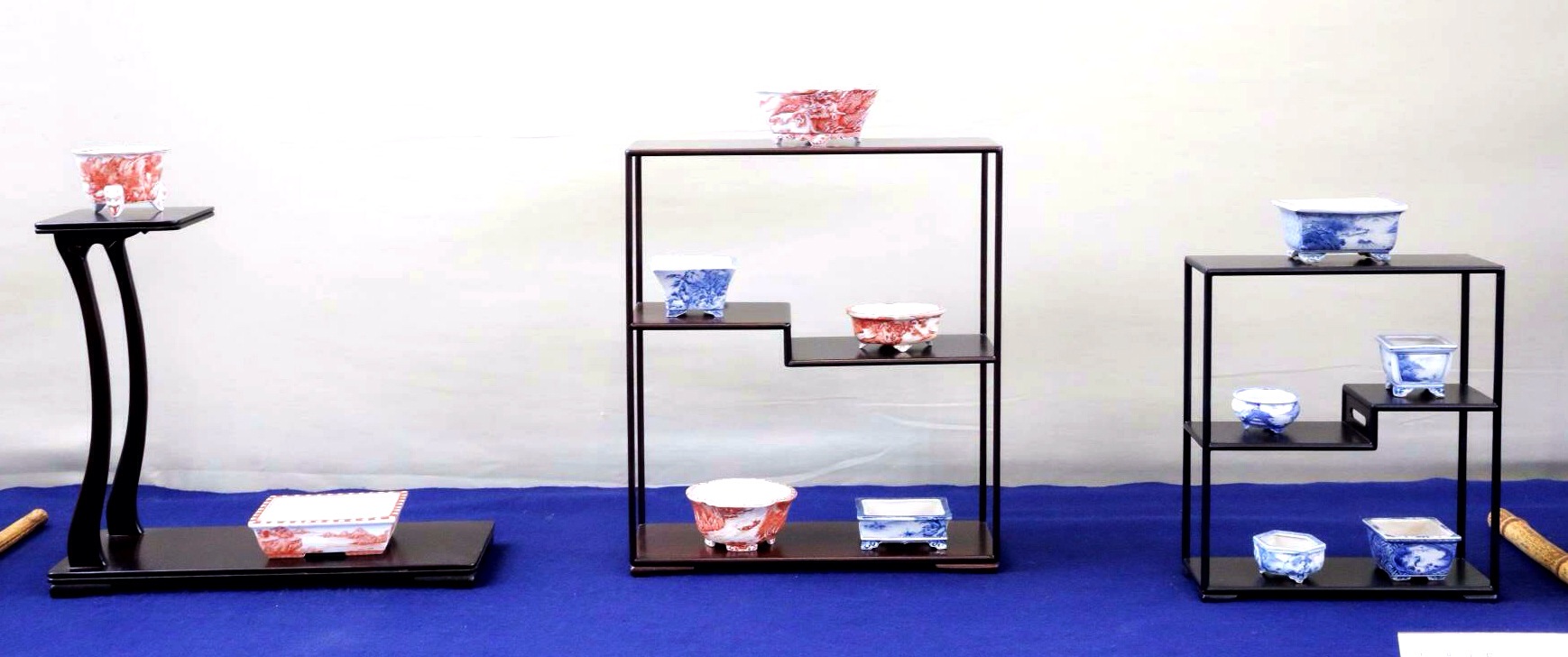 An overview of the display of 12 containers from Kutani Ikko and Kutani Ai at Shunga Ten. The reds are all Kutani Ikko and some of the blues are Kutani Ai. For more information on her, check out Part 2 of the post on the 10th Modern Bonsai Potters exhibit. Sizes, shapes, styles and color are all variable, creating an impressive and well balanced display. The balance in the display shows an interesting playfulness with symmetry: reds on one side, blues on the other, and a mix in the center. Ikko is as famous for his five color pots as any other, so this dichotomy of Ikko reds and Ai Blues is quite intentional on the part of the display creator.