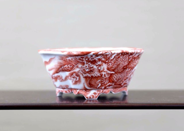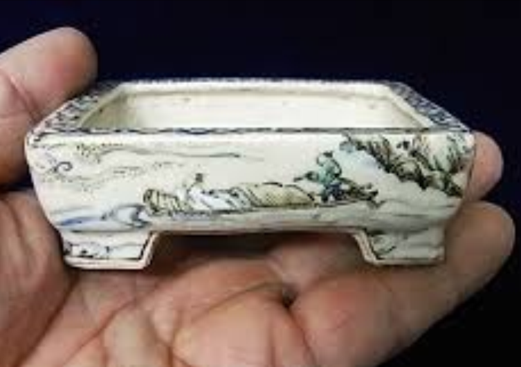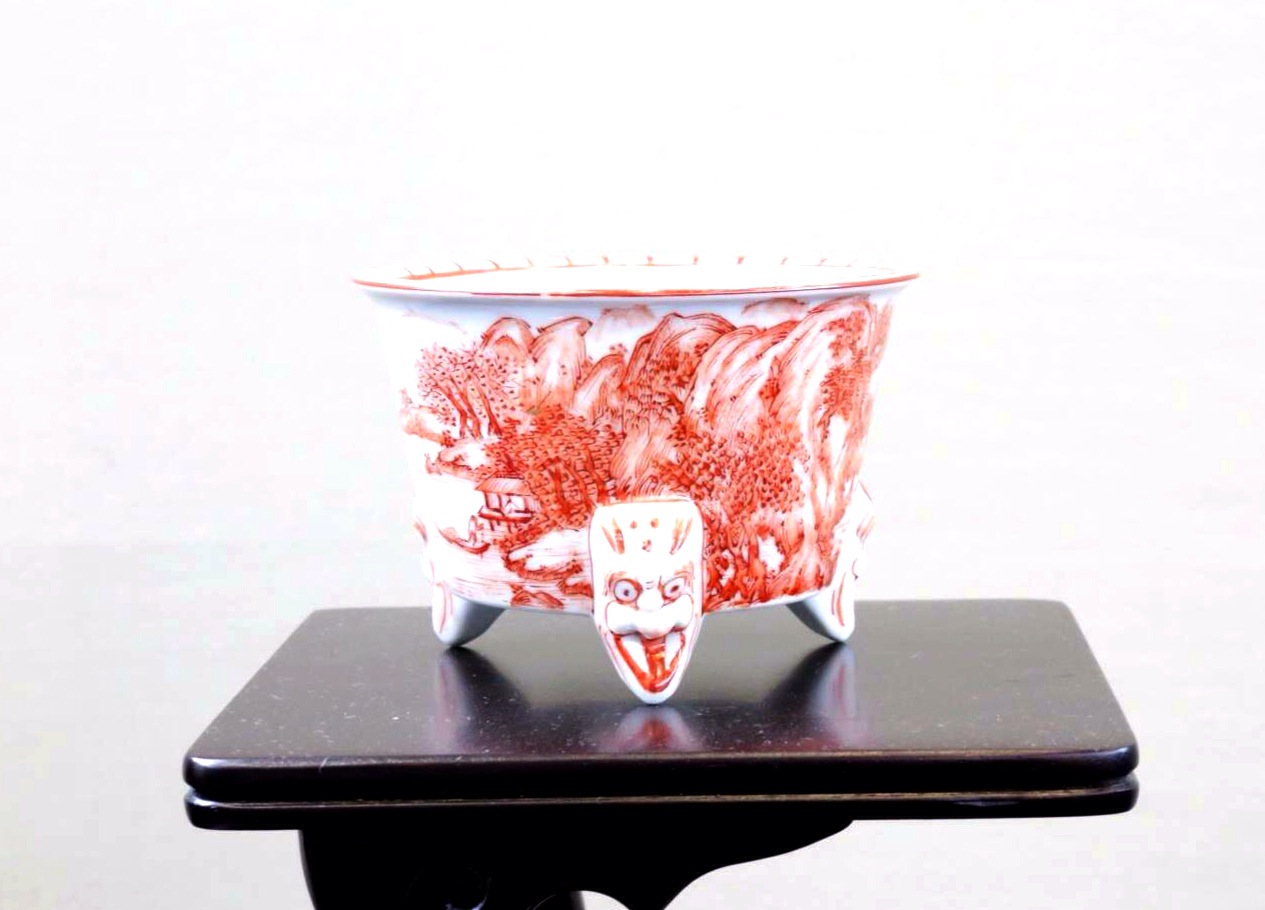 A collaboration piece dating to the late 1980s: painted by Kutani Ikko and the body created by the greatest of all Japanese painters of bonsai containers, Tsukinowa Yusen.