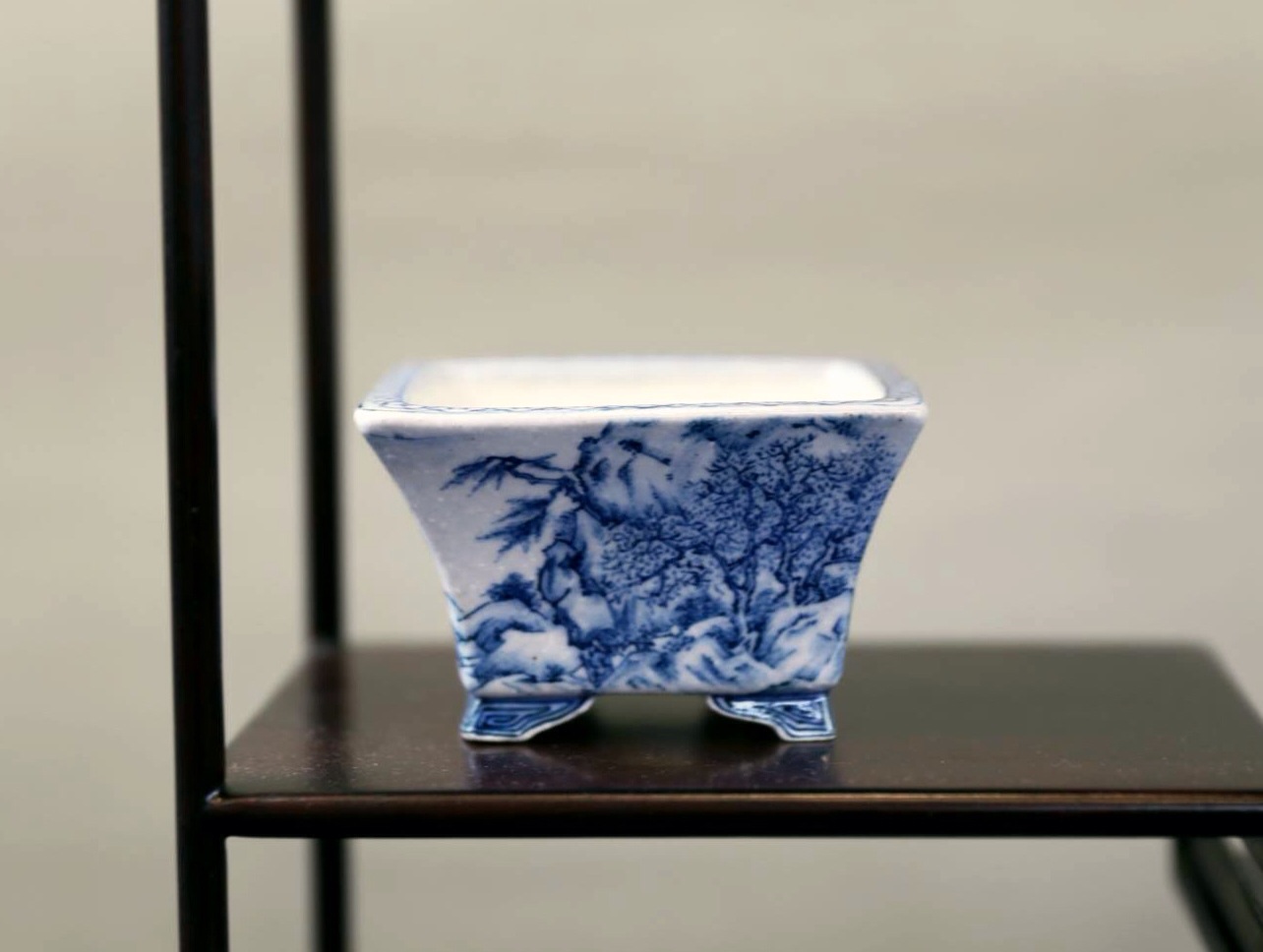 Square with lip, half-cloud feet, and sometsuke landscape with figure on Panel.