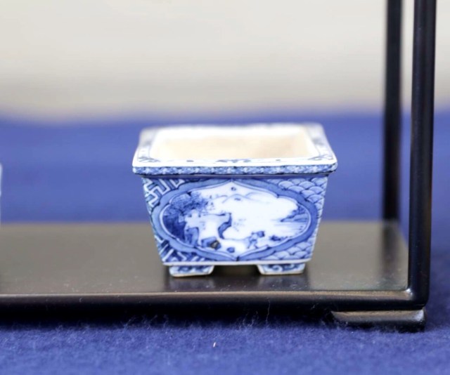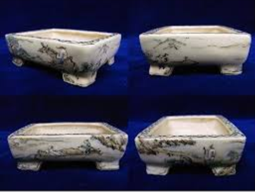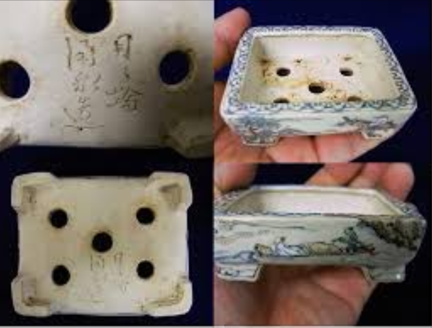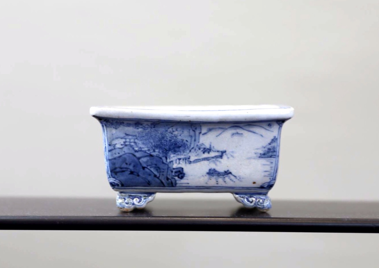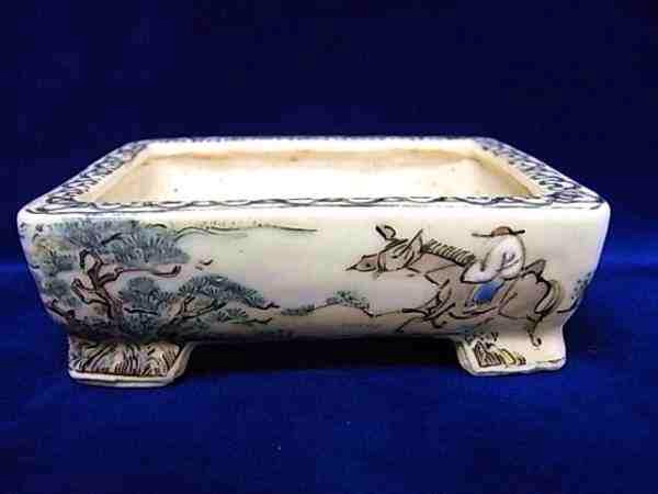 Views of the container, from multiple angles: a small rectangle with typically Yusen flared feet and go-sai overglaze enamel. Yusen is considered the representative painter in the Japanese Bonsai canon. For more on his work, follow these links: