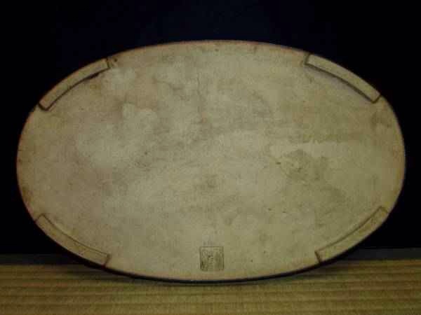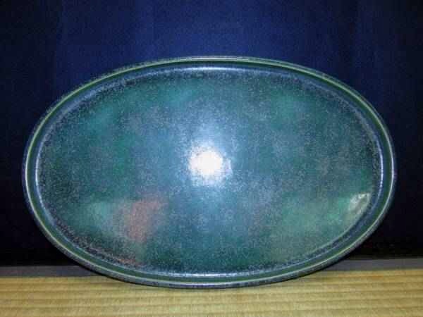 Oval Oribe showing significant blue highlights. Lovely glaze.