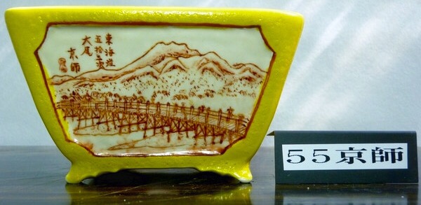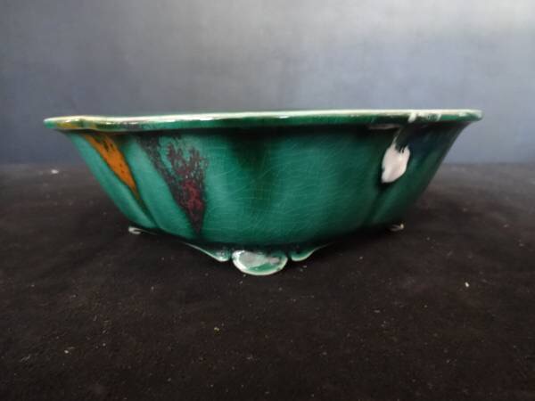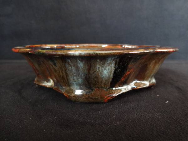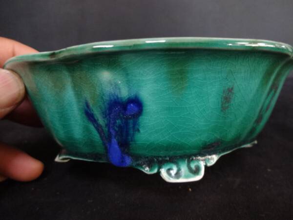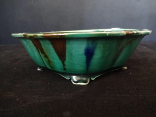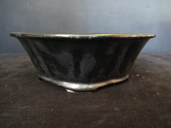 “His real name is “河村 政春” “Kawamura Seishun”. A veteran of more than 40 years as a bonsai grower, enthusiast, and lover, he is especially known for his maples. Shozan began making pots as a hobby 6 years ago. The works are all single block carved, and feature some of the best glazes I’ve seen from any modern potter, both in kiln change type glazes and clean, pure colors. Most of his glazes are kiln change type, in the best Japanese tradition of Tofukuji.”