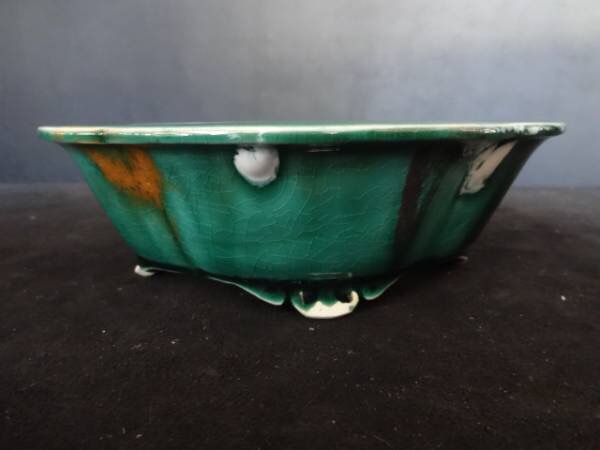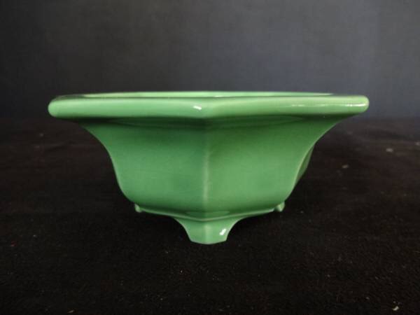 A really great light green glazed six sided pot. A little darker than celadon, I haven’t seen this color from any other artist. Ikkou’s greens come close, but it’s a hair darker.