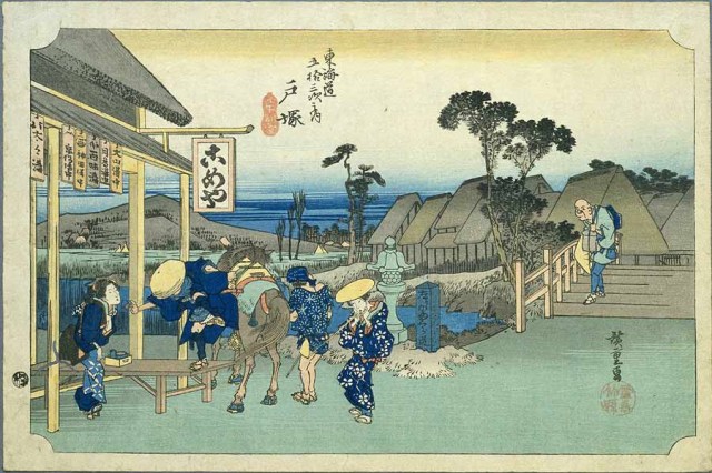 This is a small selection of the full set of Ando Hiroshige’s famous “53 Stations of the Tokaido Road”, with the corresponding woodblock prints of the original. All of the greatest painters and carvers have done versions of the “Stations”, including Sano Daisuke, Bigei, Chazan, Tosui, Shousen, and Tsukinowa Yusen.