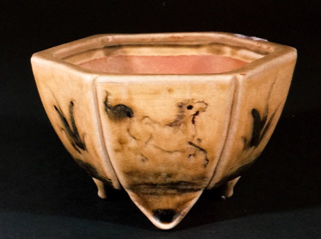 Six sided container with triangle feet in classical Oribe with painted horse. Elegant.