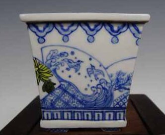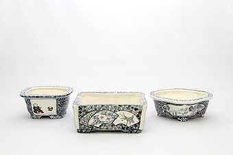 The bronze award for glazed containers went to Hiroshi Hirabayashi, for a quartet of glaze/enamel painted mini containers(the painted container category is strictly for landscape and figure paintings).  He studies bonsai at Yamato-en.  Good geometric designs and multiple shapes.