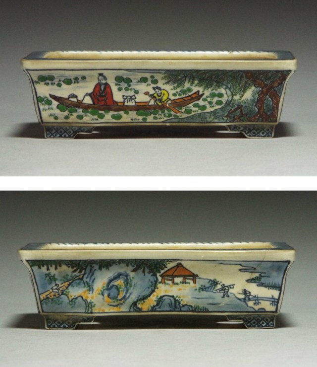 Another really interesting container showing multiple levels of talent.  The indent corners, bottom sash, and clean lines show excellent clay work, the brilliant yellow shows Ogurayama’s glazing expertise, and the ken mokko shaped panel with go-sai landscape show his painting skill.  An excellent piece, with a great patina.  Another landscape rectangle.  This piece is highly detailed, and the color variations Ogurayama pulls from the sometsuke are astounding.