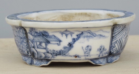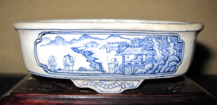 A go-sai(5 color) sansui rectangle showing excellent detail and the kind of Nanga influence we referred to earlier. A sometsuke blue underglaze painted window container with multiple figures and a cliff side landscape. Excellent detail and interesting use of movement with the negative space and the direction the figures are facing.Another go-sai, this one more typical of Katsuyama’s work than the rectangle previously shown. Less detailed but still a fantastic painted piece. The rim and feet details are especially nicely done.Another Sometsuke painted container, this one a mokko with geometric designs at the inset points. While the brush work leaves a little to be desired, with some blurry bleed, still a great container for Shohin display. Red and black overglaze enamel painting showing a much better use of negative space than the previous pieces. Excellent detail in a classical sansui landscape.Sometsuke painting of the “Fox’s Wedding”, the Japanese folklore explanation for sun showers(rain when the sun is shining). A classical motif in bonsai container painting, most every artist has used the traditional design.A tiny sometsuke mame pot with excellent detail for such a small space.Another mame pot with bird. So tiny, so whimsical, so cute and well executed.A slightly larger Ruri glazed inset panel square with landscape. The landscape on this one is a little less detailed than some of the other pieces we’ve looked at. The moderate bleed on the glaze is tolerable though, still a great piece for the price.An akae overglaze enamel landscape with temple. Great details and use of white space. I really like the landscape motif on this piece. The cliff receding into the distance adds depth and breaks up the negative space, a great detail.Another classical folklore scene of the Fox’s Wedding, this time a much better and more detailed version. In the American south, for a sun shower, we say “The devil is beating his wife.” It is surprising how many cultures associate sun showers with animals, especially foxes, in folklore. A Winter scene based on Hiroshige Ando and the 53 Stations. We’ve talked about Ando’s famous woodblock prints many times here on the site. Like “Foxes Wedding”, the 53 Stations are classical motifs at which nearly every artist tries their hand.Another gorgeous go-sai container with fantastic details and interesting positioning of the elements of the painting. The figures facing each other and the negative space on either side allows the side to be used for a bonsai with either left or right movement. Not commonly seen. Two of the painted undersides that Joshu Katsuyama is famous for and has made somewhat of a signature of his more quality work. While the pieces without painted undersides are considered lesser works, they’re often just as nice, and can more easily fit a tight display budget.