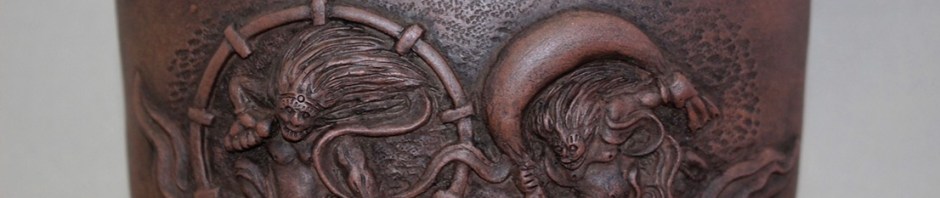 Yoshiyuki Kawada’s gold award winning sculpted pieces featuring Raijin and Fujin.