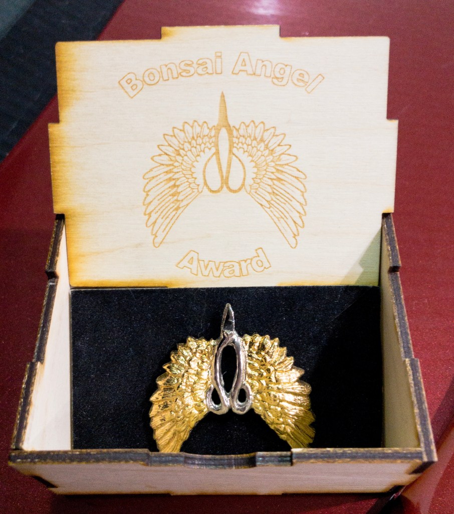 To recognize my services to the community in Charity work and in providing free pottery information through the site and database, I was made a Bonsai Angel at the 2018 National Exhibition. An exclusive honor that comes with a lovely Gold pin….it was the first and will be the last time anyone calls me an Angel. Never been so humbled in my life…nor have I ever been speechless.