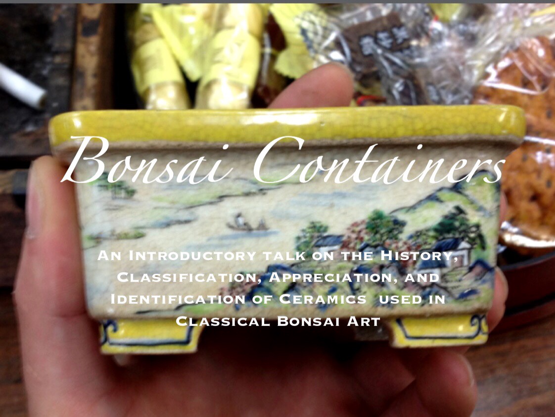 - Overview Lecture Series: My Bonsai Pottery Overview lecture series comes in 3 parts. Each part is a stand alone lecture, featuring a mixture of Beginner, Intermediate, and Advanced information. They covers a range of topics including History, Appreciation, Classification, Discernment, Identification, and Selection. Each lecture is 1.5-2 hours long with Power Point, followed by a Q and A where I can identify and appraise members’ containers, or discuss selection for specific trees. Each lecture includes a container of Recognized Artist Tokoname quality or higher, to be raffled or auctioned at the Club’s discretion.